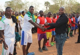 Afisa Mtendaji wa kata ya Uyogo Edson Monela akikabidhi zawadi kwa wachezaji wa timu ya Uyogo stars katika bonanza la michezo kwa ajili ya kutoa elimu kuhusu mila na desturi kandamizi lililofanyika ka...