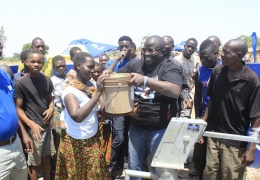 Meneja Masoko wa Kampuni ya TIGO kanda ya Ziwa Ndg. Ally Mashauri akimtua Ndoo ya Maji Mkazi wa kijiji cha Ulowa namba 4 Wilayani Ushetu mkoani Shinyanga Tatu Kapembe., wakati wa uzinduzi wa kisima ch...